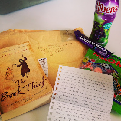 I also had the idea to send each other a copy of a favorite book that has a different cover in the UK vs the USA. She's a fellow book lover and I personally feel that there is no greater bond than sharing books. She sent me a copy of The Book Thief that I have been dying to get. This book is my absolute favorite (Along with Gatsby) and the British cover is perfect beyond words. It's quite possible that I cried when I saw it and held it and smelled it. Oh books.